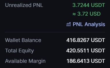 레버리지만 ai 트레이더가 말 한 것 처럼 7로 해서, usdt 490개 롱 오픈했습니다. 5% 수익 손실 usdt 4개를 목표로 합니다. 자본이 작은 상태라 이익 손실도 작아 인간 트레이더 여도 심리적으로 흔들리지 않는 장점이 있습니다. 지루할 정도네요. 이건 권장하는 기분 상태니 여기서 부터 이기고 갑니다.
